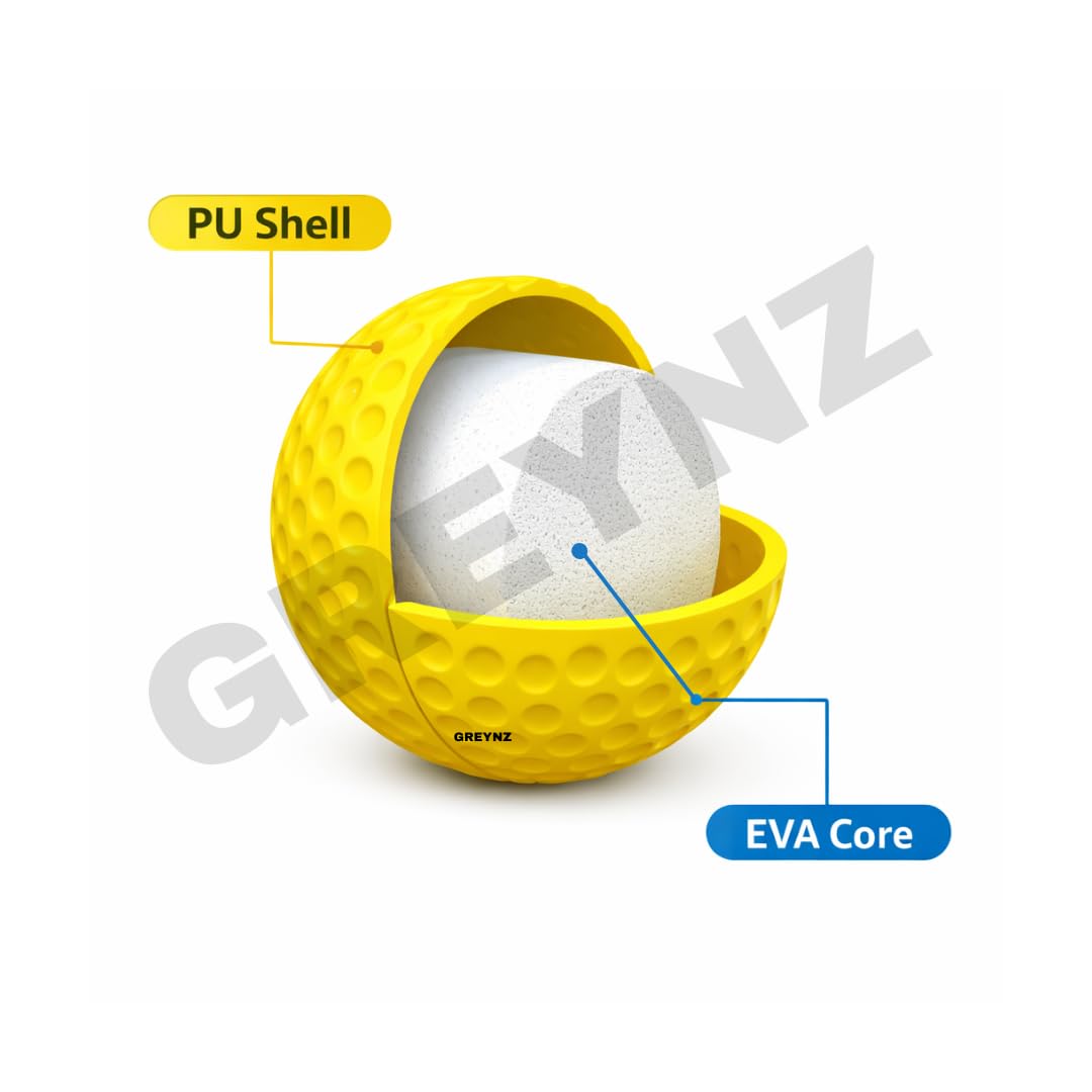 The GREYNZ Ultra Fly Yellow Big Dot Dimple Cricket Practice Ball is engineered for serious training and consistent performance. Designed specifically for bowling machine and net practice use, this ball features a big dot dimple pattern that enhances visibility and ball tracking during fast deliveries. Built using dual-layer technology, the inner 55% EVA core provides excellent shock absorption and impact control, while the 45% polyurethane outer shell delivers superior durability, shape retention, and resistance to wear. This advanced construction results in an unbreakable build with full, consistent bounce, even during extended training sessions. With a precisely calibrated 80-gram weight, the GREYNZ Ultra Fly ensures smooth operation in bowling machines and dependable performance for batting drills, reflex training, and skill development. Ideal for cricket academies, clubs, and personal practice, this ball is a reliable choice for players looking to elevate their training quality.